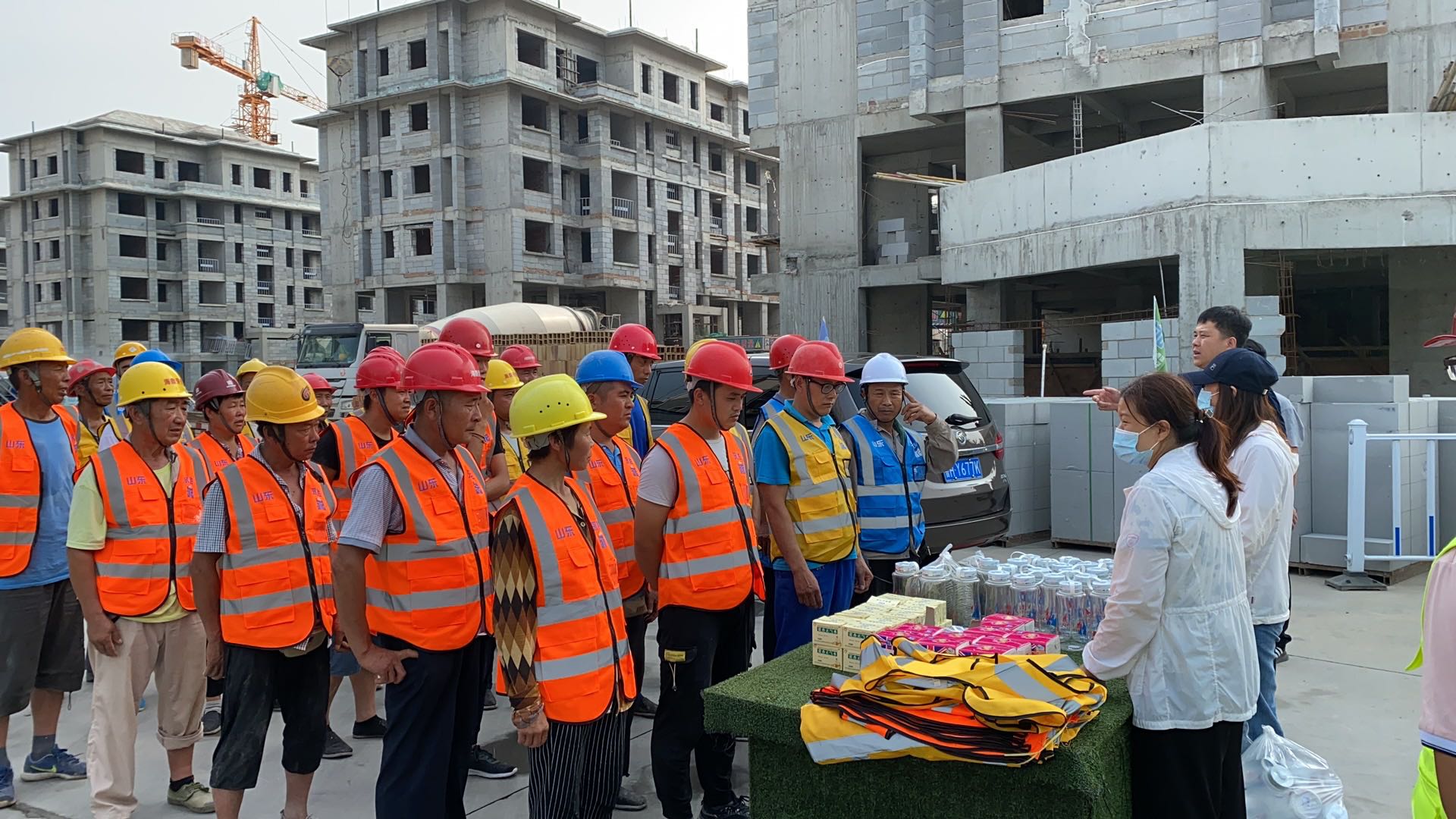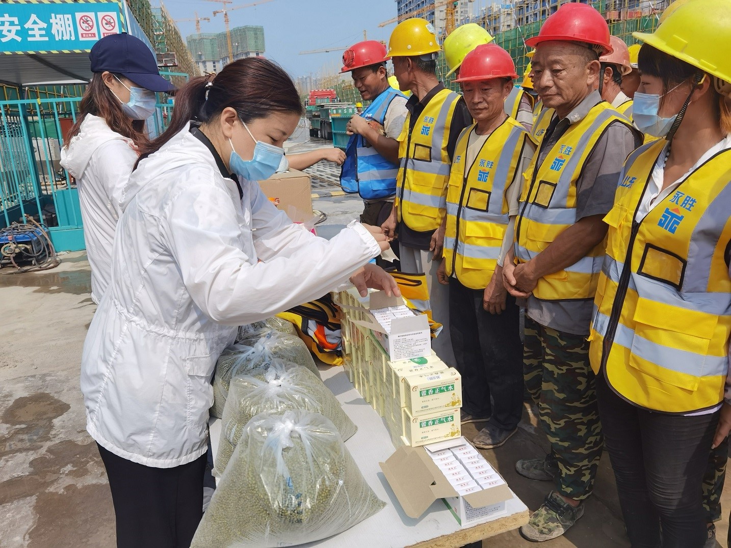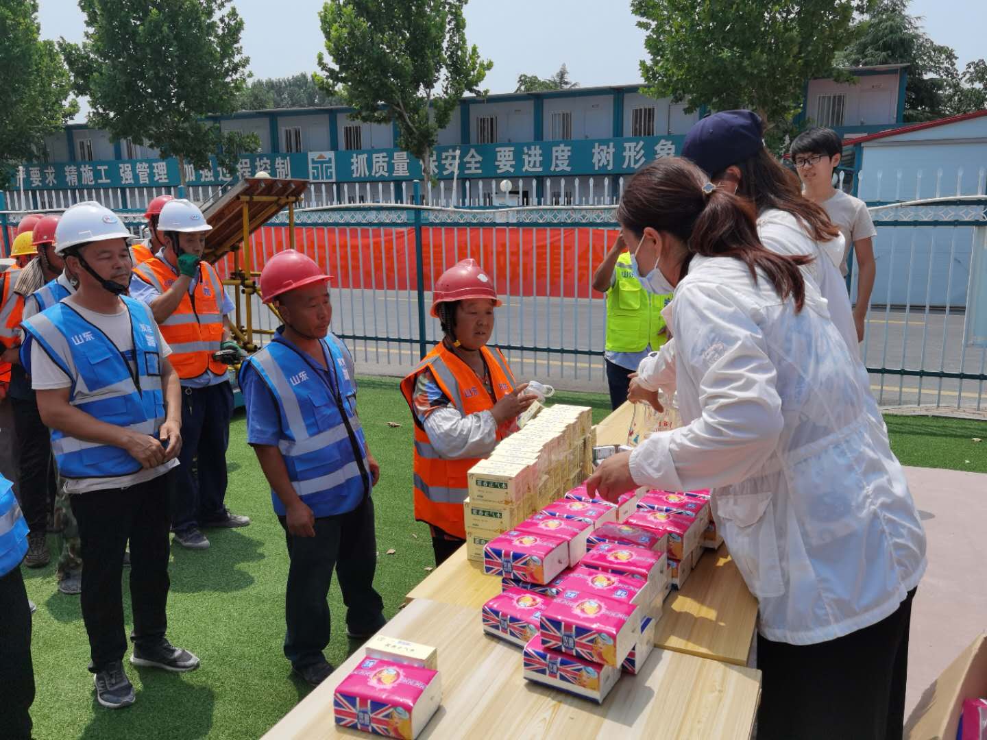 夏日里骄阳似火、酷热难耐,烈日灼烧的工地上,建设者们埋头苦干、挥汗如雨,用辛勤的汗水谱写着酷暑下热火朝天的动人画面。7月8日,集团办公室、施工管理部代表集团公司高管层、工会,深入天绘商业街、京投SOHO、柳行幼儿园、海达会展中心、紫麟府二期、兖州瑞马等施工现场,为工人们送去了绿豆、水杯、风油精、藿香正气水、纸巾等消暑物品,并叮嘱工人们保重身体,做好防暑降温工作,确保安全生产,真正把清凉送到了施工现场,把关怀送进了工人心坎。